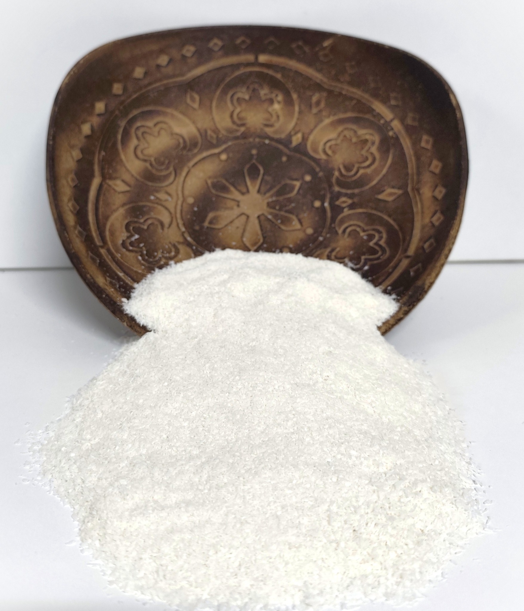 O coco ralado é a polpa do coco desidratada e triturada em pequenas lascas ou partículas, com sabor adocicado e aroma característico, ideal para confeitaria e culinária.