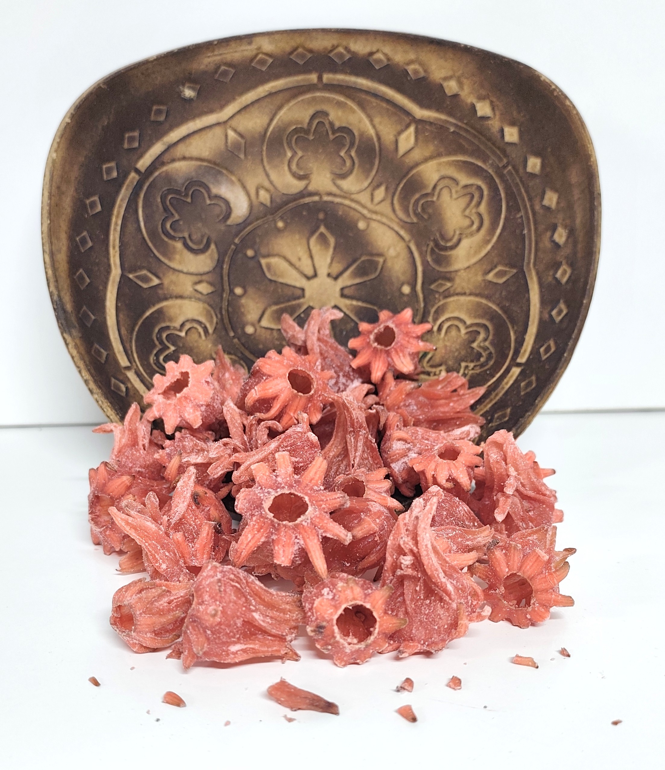 O hibisco desidratado é obtido a partir das pétalas da flor Hibiscus sabdariffa. Caracteriza-se pela sua cor vermelha intensa e um sabor marcadamente cítrico e refrescante. É um dos ingredientes botânicos mais populares para a preparação de infusões vibrantes, tanto quentes como frias