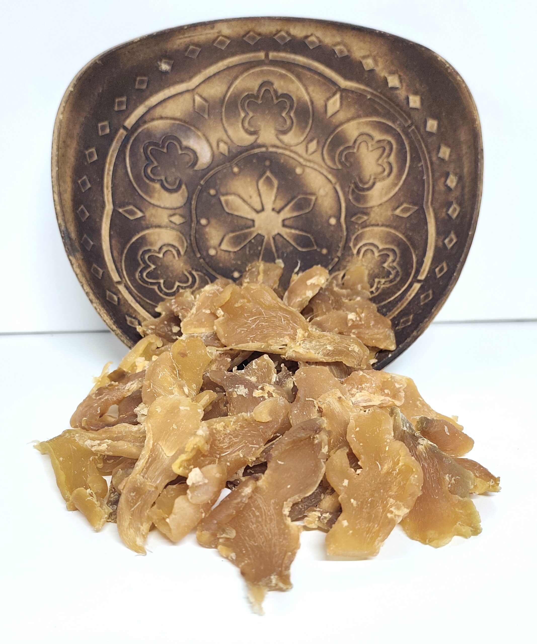 O gengibre desidratado sem açúcar é obtido a partir do rizoma fresco da planta, que é fatiado e seco a temperaturas controladas. Ao contrário da versão cristalizada, esta mantém o perfil de sabor original: terroso, cítrico e marcadamente picante. Apresenta uma textura mais fibrosa e firme, sendo uma forma prática e concentrada de consumir gengibre em qualquer lugar.